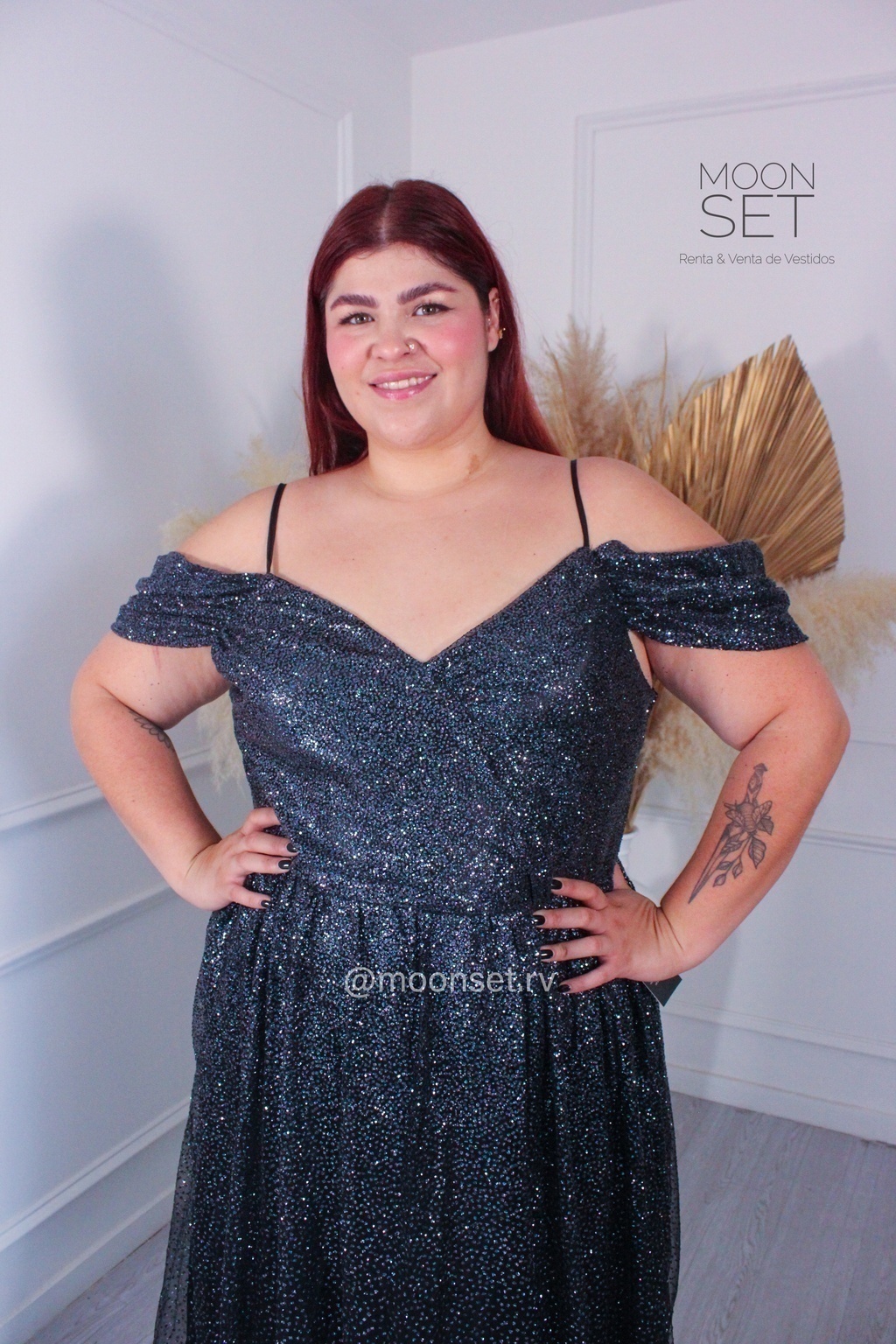 Vestido repleto de glitter, en corte linea A, off-shoulder (lo cual cubre la parte superior del brazo) y tirantes.