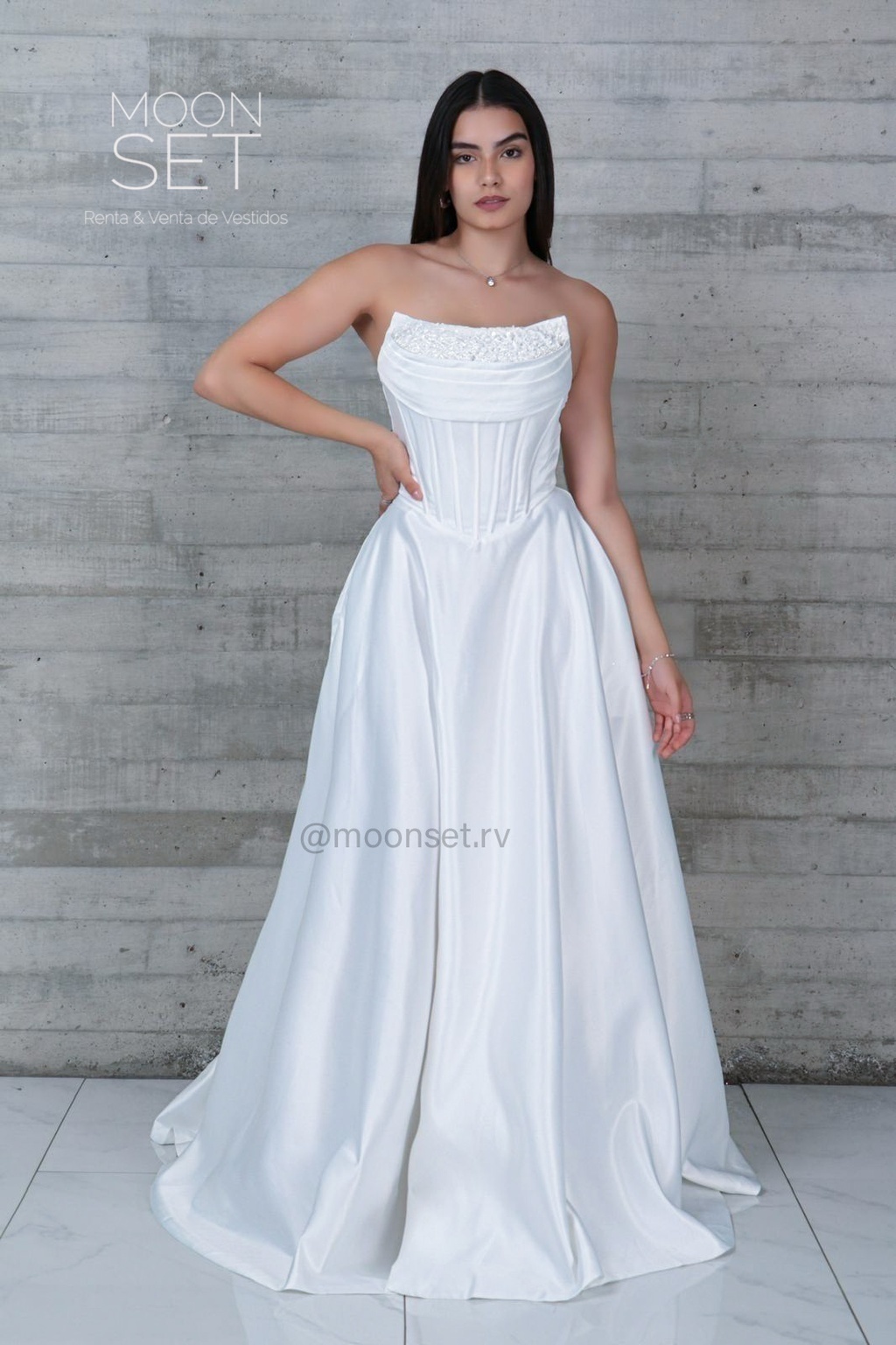 Hermoso y elegante vestido blanco en corte linea A, largo, diseñado con una caída hermosa y detalles de aplicaciones en perlas en el escote. Es tipo corset con copas incluidas, varillas y tiras en la espalda, lo cual acentúa tu cintura y se amolda perfecto a tu cuerpo. Disponible en diferentes tallas, incluyendo tallas extra S a XL, con envío confiable a todo México y atención especial para novias que desean que su vestido sea tan memorable como su día.